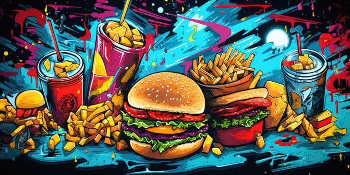 fast food illustration with burgers pizza fries ice cream and drinks in cartoon doodle style on dark background with bold cheerful title and vibrant design perfect for creative food projects