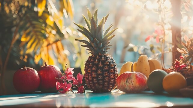 A vibrant pineapple and assorted fruits on a table with a blurred tropical background.