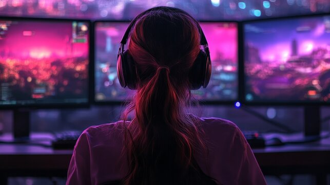 A woman wearing headphones sits in front of three computer monitors, playing a video game.