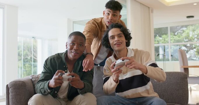 Diverse male friends at home starting game with controllers after friend arriving and offering tips