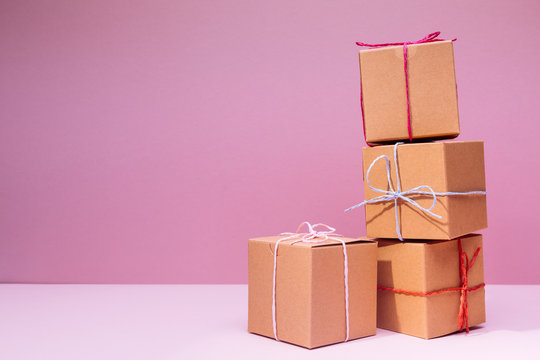 Craft cardboard gift boxes on the solid pink background. Holiday and gift concept