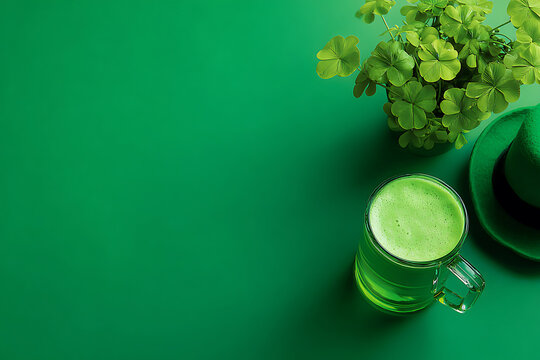 st patricks day celebration, st patricks day design featuring shamrock bouquet, green beer mug, leprechaun hat detail, vibrant green tones, and ample text space