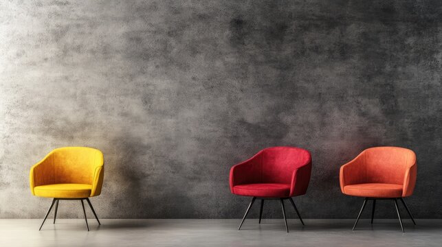 Colorful modern chairs in red, orange, and yellow arranged against a textured gray wall, symbolizing a vibrant hiring concept in a workspace setting.