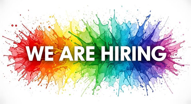 We are hiring text on a vibrant rainbow paint splash background, isolated on white background