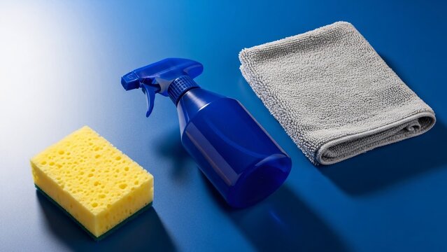 Cleaning tools assortment on a vibrant blue surface with bright lighting