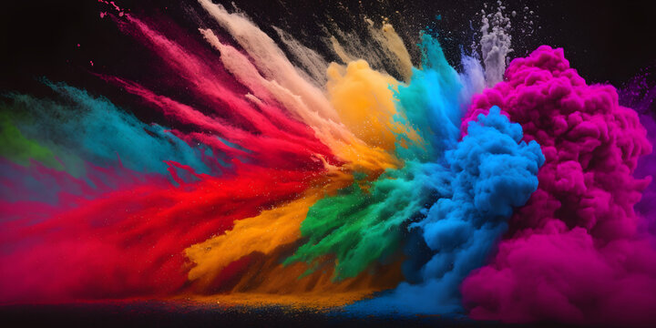 illustration of abstract colorful Happy Holi background card design. Powder Holi paints banner, colorful explosion cloud, ink splash, decorative vibrant dye for festival, traditional indian holiday.