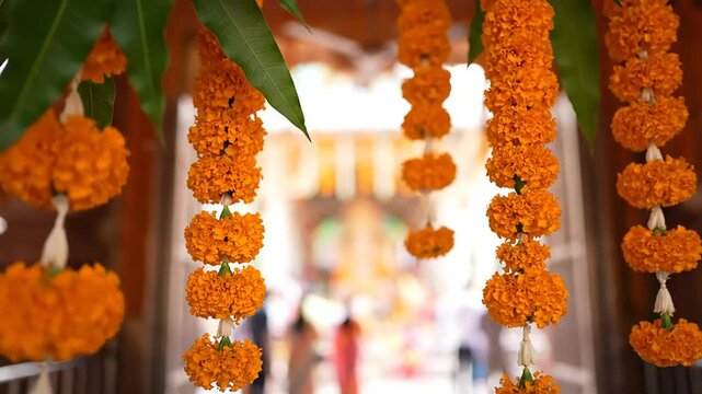 Beautiful vibrant marigold garland decoration hanging suitable for festive season traditional ritual, background element, invitation card, ceremony decor, cultural event