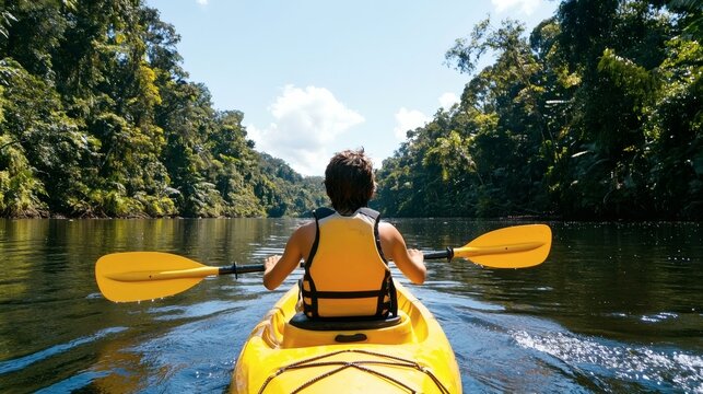 Experience a tranquil kayaking trip on a peaceful river, surrounded by vibrant trees and soothing currentsan ideal outing for nature lovers and outdoor enthusiasts seeking adventure