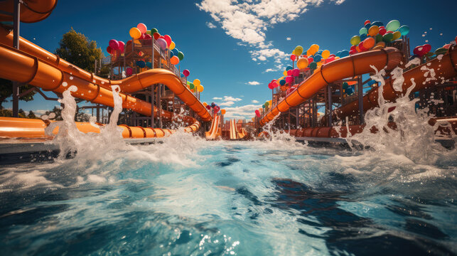 Water Park Adventure. Wide-angle photo of a kid swimming in a vibrant water park-themed setting. Fun-filled aquatic excitement concept.