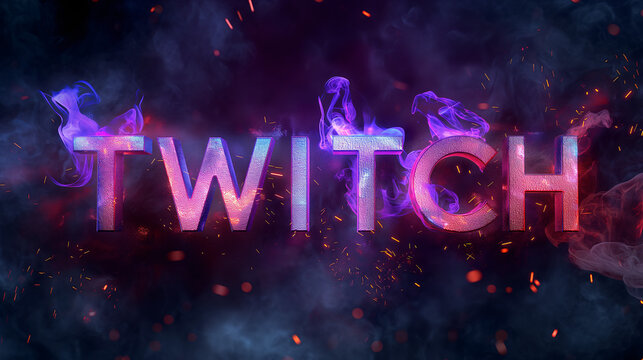 The Twitch logo, rendered in 3D, is engulfed in vibrant purple flames against a backdrop of swirling smoke and sparks