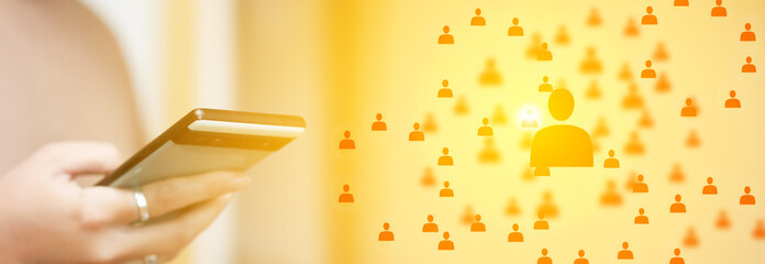 Abstract HR concept centered on a phone, illustrating digital recruitment and global workforce management. HR management recruitment concept orange many people