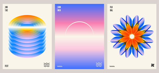 Gradient Summer Poster Set – Music Fest, Sunset Vibes, Abstract Floral Design. Abstract gradient cover background set with dynamic fluid gradient beach, sun, wave, flower. Vector illustration