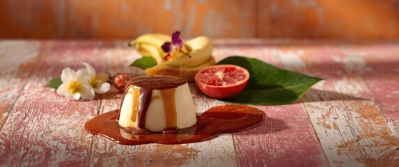 Delicious Panna Cotta topped with chocolate and caramel sauces, set against a vibrant wooden background with flowers and greenery