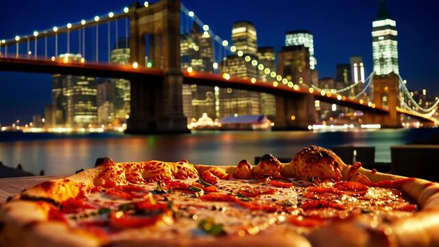 A vibrant pizza in the foreground with a stunning city skyline and illuminated bridge at night, evoking a lively urban dining atmosphere