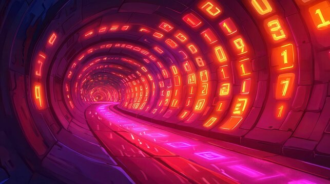 A vibrant digital tunnel featuring glowing numbers and colorful lights.