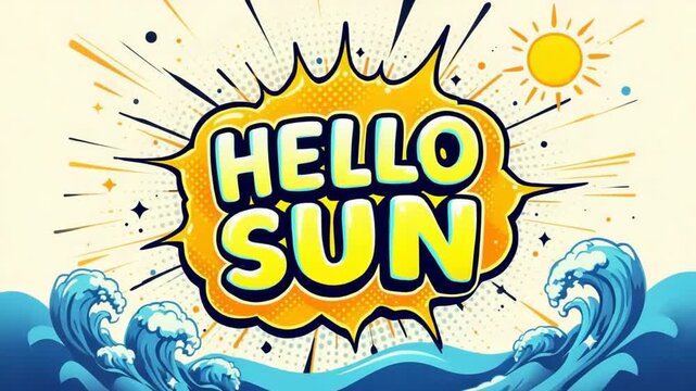 Vibrant comic style "Hello Sun" message bursts with dynamic energy, waves crash, and a bright sun shines, perfect for summer promotions and joyful greetings.