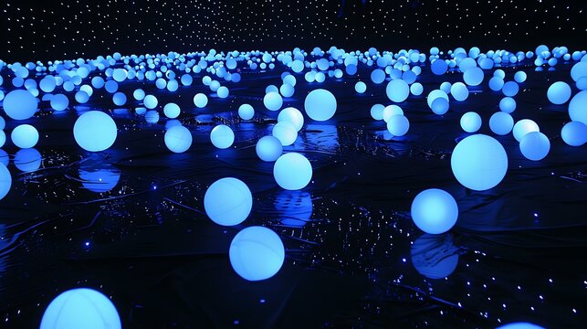 A vibrant spread of luminous blue orbs scattered across a black canvas, with a gentle sparkle adding depth and mystique