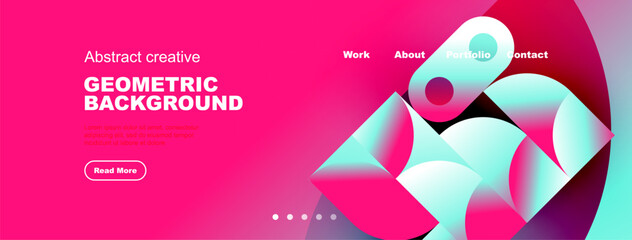 Bright pink banner features abstract shapes, text, navigation menu. Modern design promotes creative portfolio website.