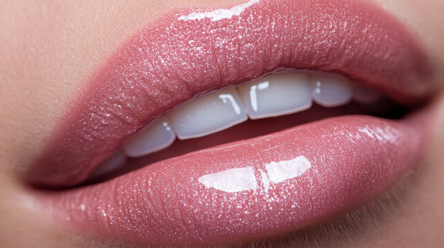 Close-up of glossy, pink lips with a bright shine, showcasing a fresh and vibrant look, ideal for beauty and cosmetic themes.