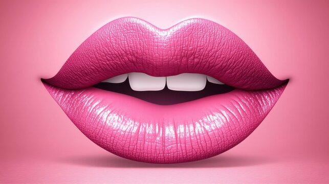 Close-up of vibrant pink lips with a glossy finish, set against a soft pink background, exuding confidence and allure.