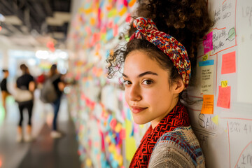 A young, curly-haired woman smiling in front of a colorful sticky note-filled board at a creative coworking space.