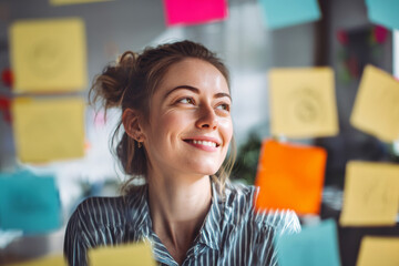 Young adult Caucasian businesswoman surrounded by colorful notes and startup sketches, enthusiastically planning strategies in a vibrant office