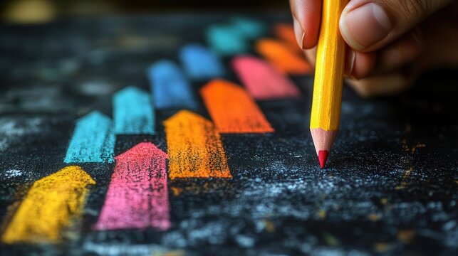 hand sketching vibrant multicolored arrows on a weathered chalkboard symbolizing growth direction and creative planning