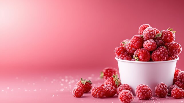 A vibrant display of fresh raspberries set against a bright pink backdrop, showcasing the fruit’s juiciness and natural appeal, evoking feelings of sweetness and freshness.