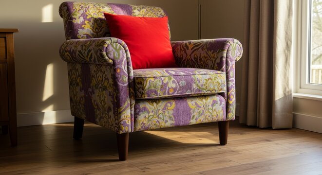 Colorful Armchair with Red Pillow and Wooden Legs - Comfort, elegance, relaxation, home decor, and are symbolized in this of a vibrant patterned armchair with a red accent pillow