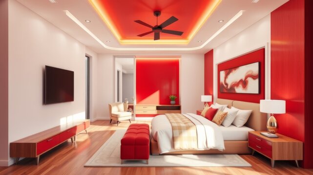 Living room with bold red accent wall, matching cushions, and modern dcor for a vibrant ambiance