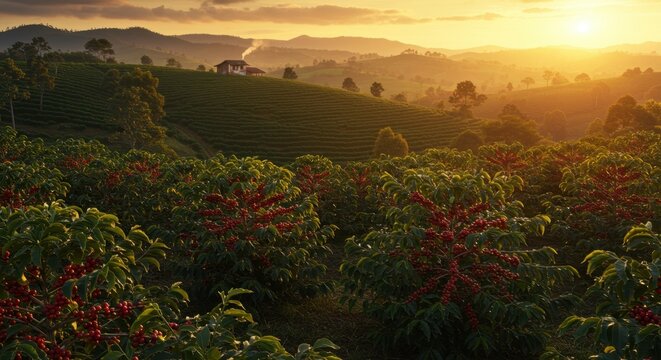 Golden sunrise over lush coffee plantation with ripe red berries and distant farm