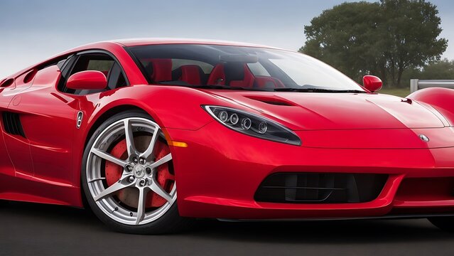 A vibrant red car racing down a jet-black road, contrasted by stark white lines under a clear azure sky