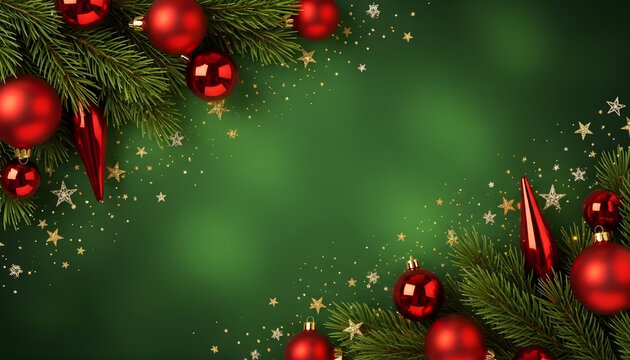 Festive red Christmas background with ornamental baubles, pine branches, and golden holiday decorations