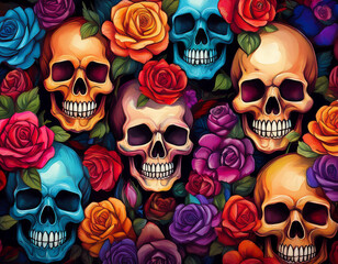 Colorful skulls and roses pattern, creating a vibrant and festive Halloween design. _1(179)