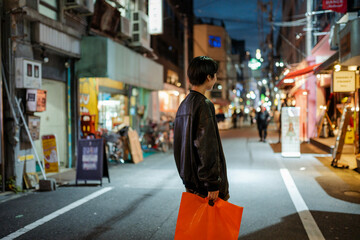 A vibrant and minimalistic online shopping advertisement concept with colorful shopping bags and decorations