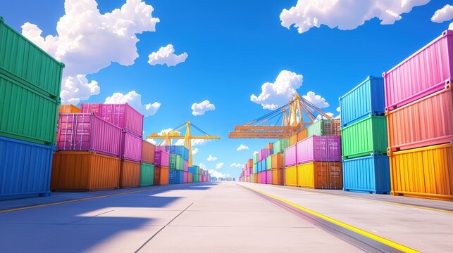A vibrant scene of colorful shipping containers lined along a clear path under a bright blue sky with fluffy clouds, suggesting an active port environment.cargo management warehouse scheduling