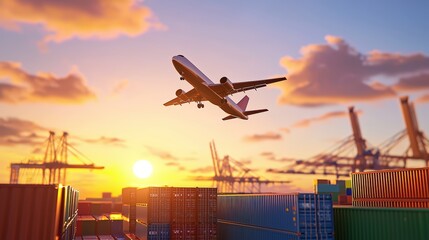 An airplane ascends against a vibrant sunset, with shipping containers and cranes visible, capturing the essence of transport and industry.cargo management warehouse scheduling
