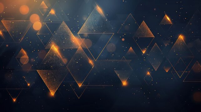 A dark blue background is adorned with a series of glowing orange triangles