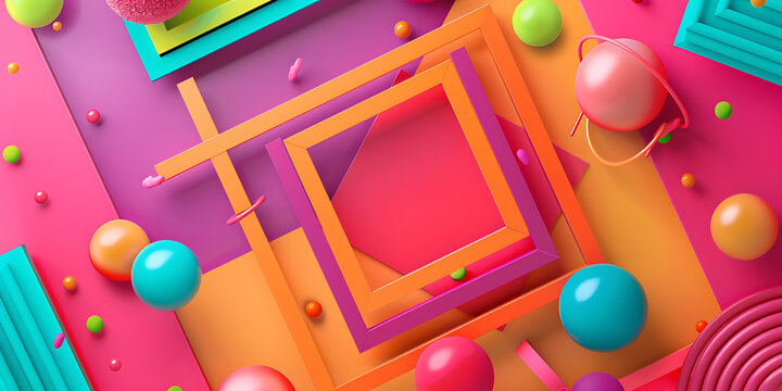 Bright pink, orange and blue geometric shapes and spheres create a playful and modern abstract design for a fun and vibrant social media post.