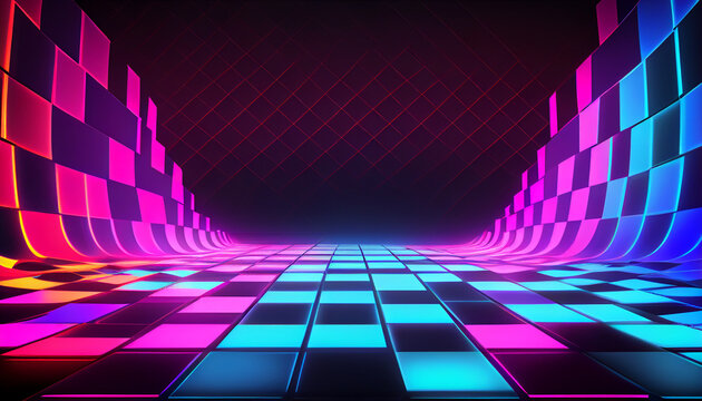 Neon lights illuminate a smoky stage with speakers, creating a vibrant, futuristic atmosphere.