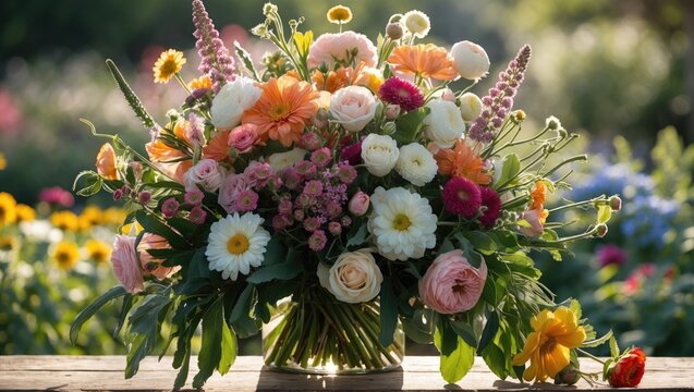 Hands holding vibrant bouquet of summer blossoms promoting garden center
