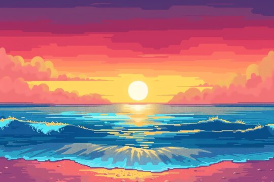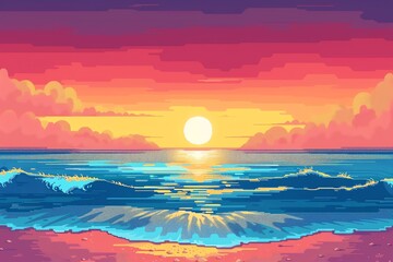 Vibrant sunset over the sea featuring stylized clouds and a bold color palette