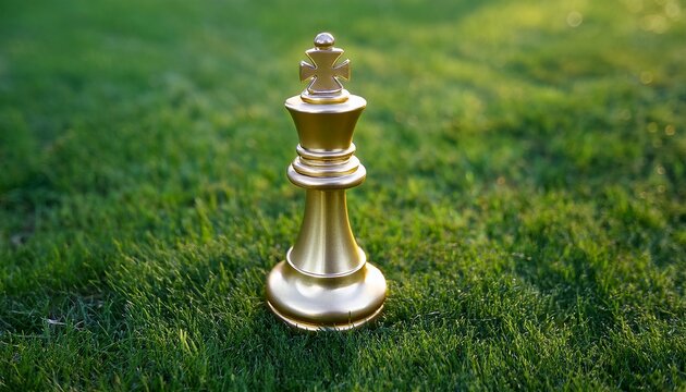 gold chess king positioned centrally on a vibrant green checkerboard grass background with ample copy space highlighting leadership and strategy