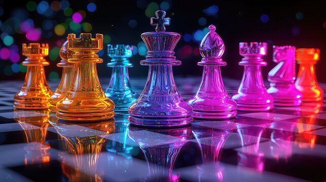 Colorful glass chess pieces on a reflective board, illuminated with vibrant bokeh lights.
