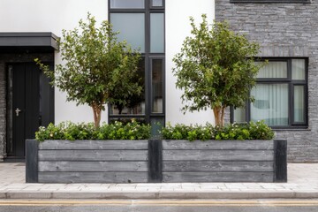 In a vibrant city setting during the daylight hours, wooden planters elegantly display a variety of lush trees and shrubs in front of a contemporary building