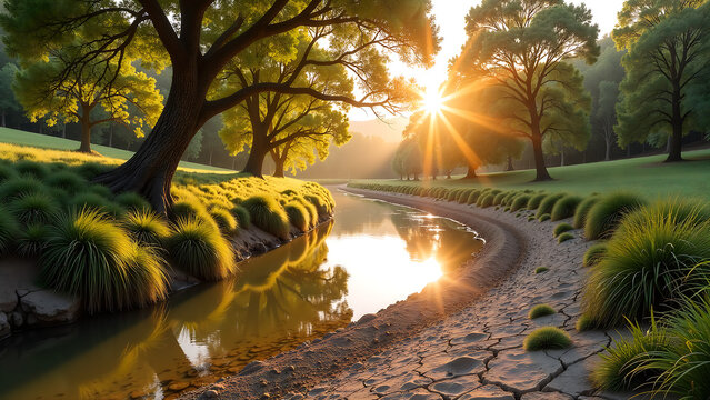 warm golden light casts serene glow cracked earth lush vibrant trees andalusian countryside surrounded gentle