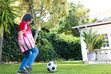 Asian girl kicking black-and-white soccer ball on lawn near house patio with potted plants