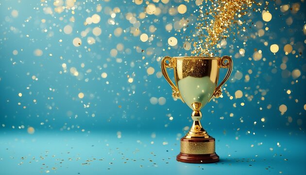 a golden trophy stands prominently against a vibrant teal backdrop as glittering confetti rains down, symbolizing achievement and celebration.