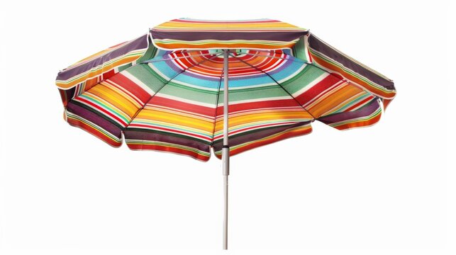 A large beach umbrella with vibrant multicolored stripes in various patterns, designed for sun protection and to add a pop of color to any beach outing.