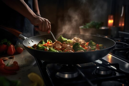 Hands preparing healthy stir-fry meal in a modern kitchen, with colorful vegetables and a sizzling pan. Generative AI.